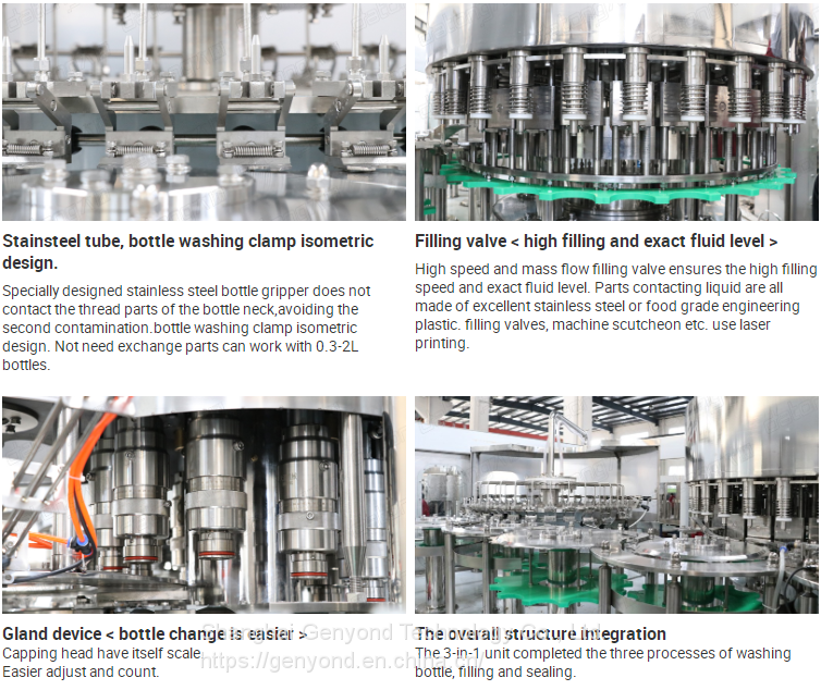 Diese Maschine wird haupts?chlich zur Flaschenreinigung, -füllung und -verschlie?ung von Saft, Milch und Getr?nken verwendet. Der fortschrittliche OMRON-Programmierbare Logikcontroller (PLC) wird eingesetzt, um den automatischen Betrieb der Maschine zu steuern. Die Flaschenzuführkette verwendet einen Frequenzumrichter zur Geschwindigkeitsregulierung und koordiniert sich mit dem Frequenzumrichter der Hauptmaschine, um die Bewegung der Flaschen stabil und zuverl?ssig zu machen. Sie ist die erste Wahl für Getr?nkehersteller.