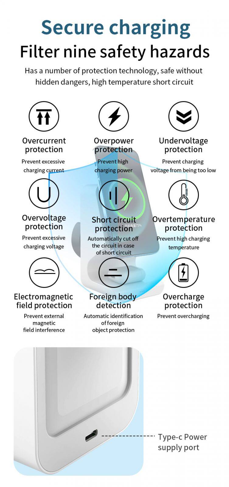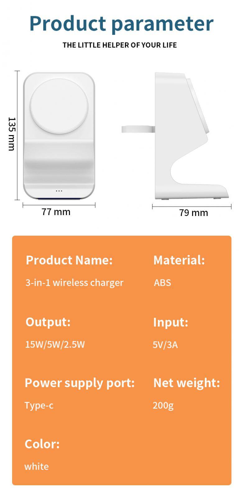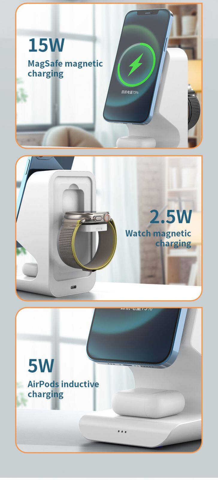 Merkmal | 1: 15W Schnellmagnetischer kabelloser Ladeger?t, kompatibel mit 10W, 7,5W, 5W. 2: 3W kabelloses Laden für AirPods 3: 2,5W kabelloser Ladeger?t für iWatch | ||||||