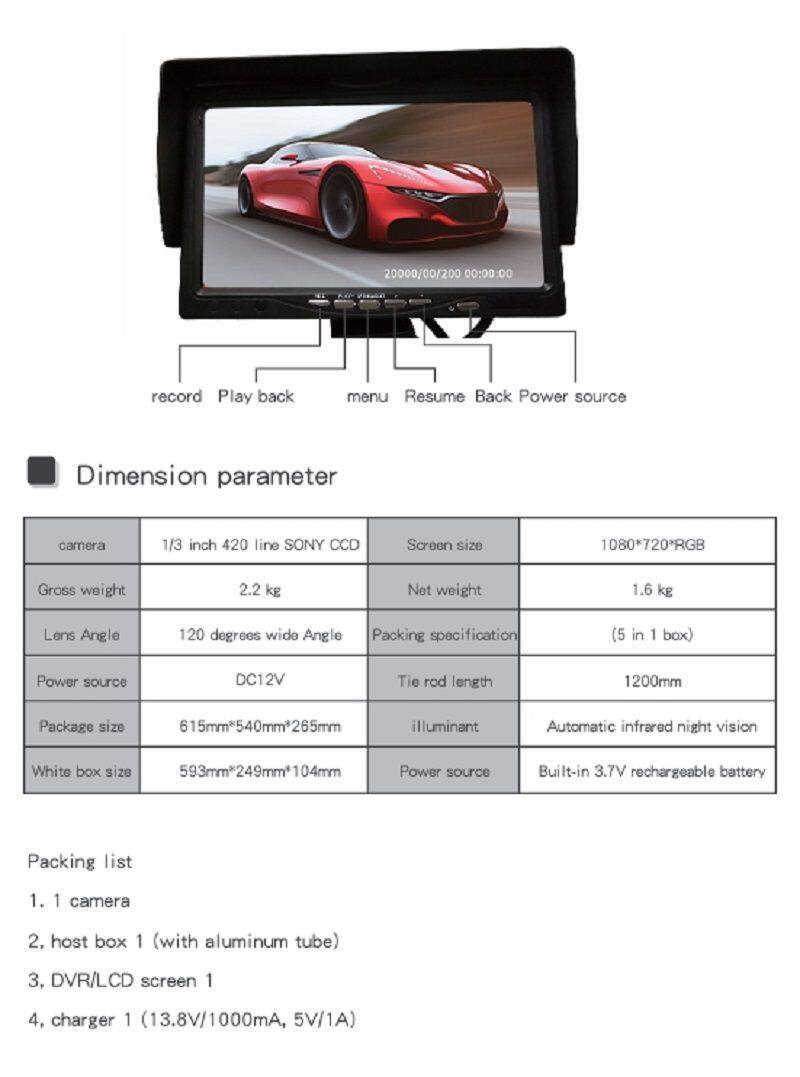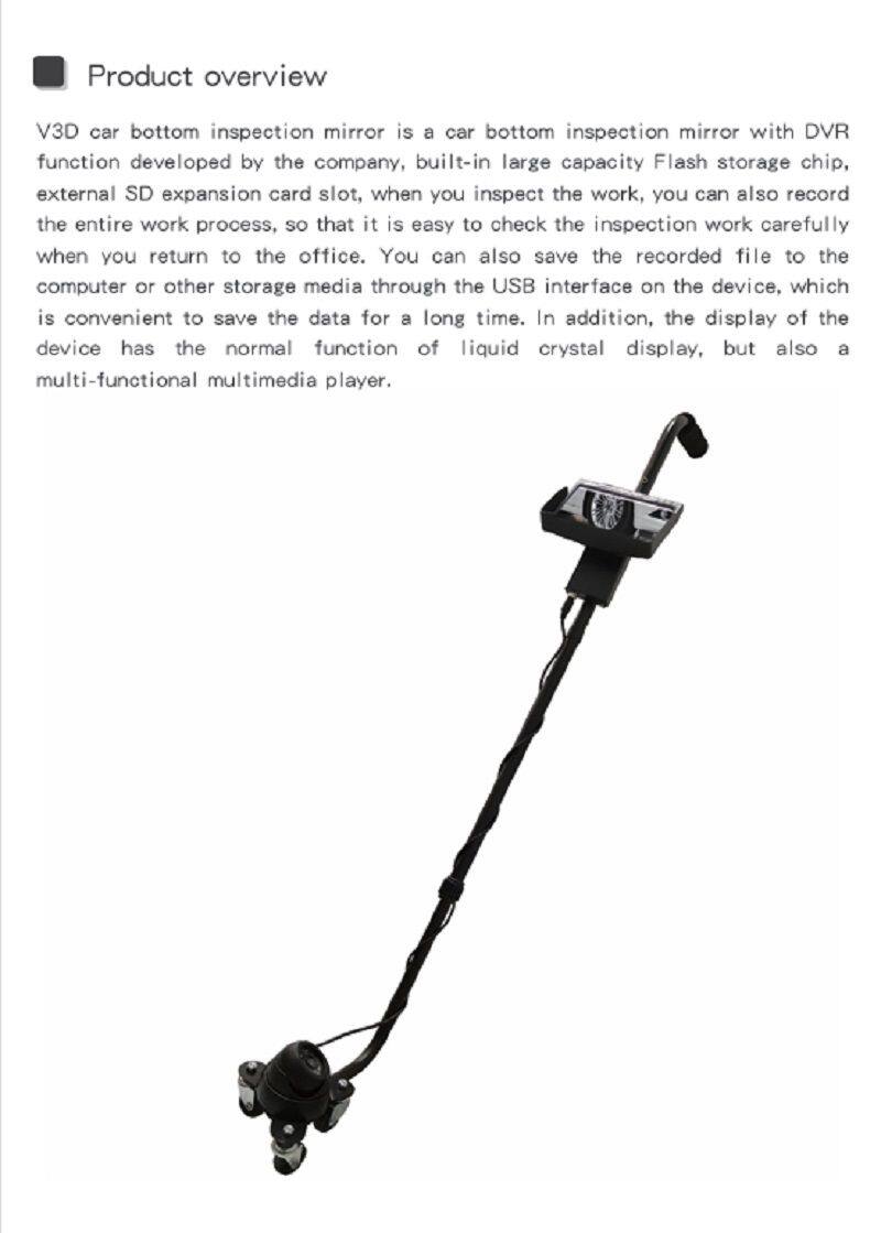 Der V3D-Spiegel zur Inspektion des Fahrzeugbodens ist ein Spiegel zur Inspektion des Fahrzeugbodens mit DVR-Funktion, der von der Firma entwickelt wurde. Er verfügt über einen eingebauten Flash-Speicherchip mit gro?er Kapazit?t und einen externen SD-Erweiterungsspeicherslot. Wenn Sie die Inspektion durchführen, k?nnen Sie auch den gesamten Arbeitsablauf aufzeichnen, sodass es einfach ist, die Inspektionsarbeit sorgf?ltig zu überprüfen, wenn Sie ins Büro zurückkehren. Sie k?nnen die aufgezeichneten Dateien auch über die USB-Schnittstelle am Ger?t auf den Computer oder andere Speichermedien speichern, was es einfach macht, die Daten langfristig aufzubewahren. Darüber hinaus hat der Bildschirm des Ger?ts nicht nur die normale Funktion eines Flüssigkristallbildschirms, sondern ist auch ein multifunktionaler Multimedia-Player.