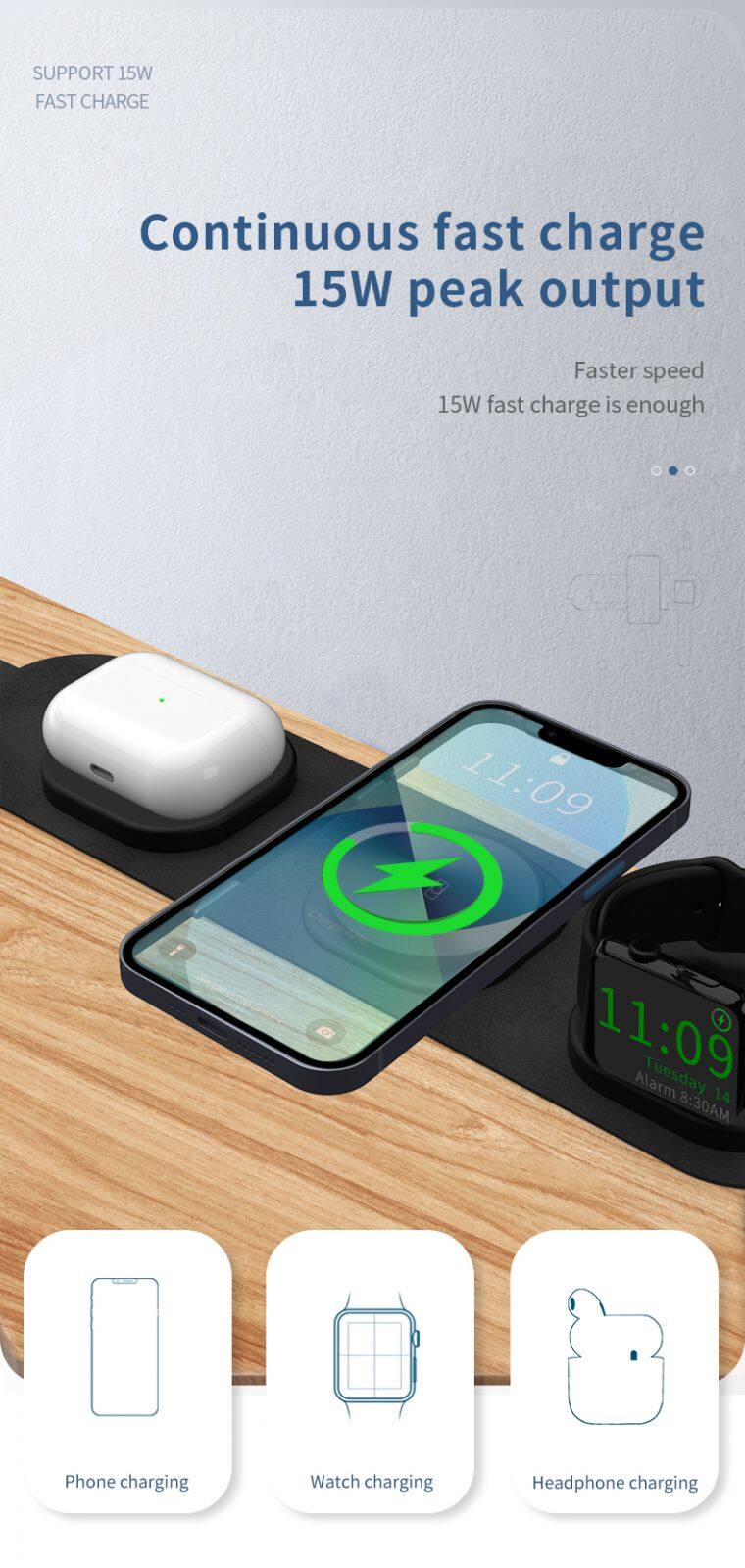Portable 3 in 1 15W Wireless Charger for Smart Phones Watches Earphones