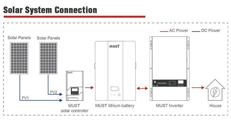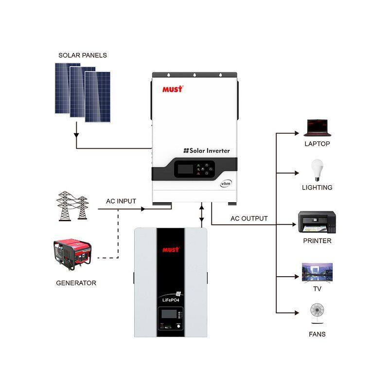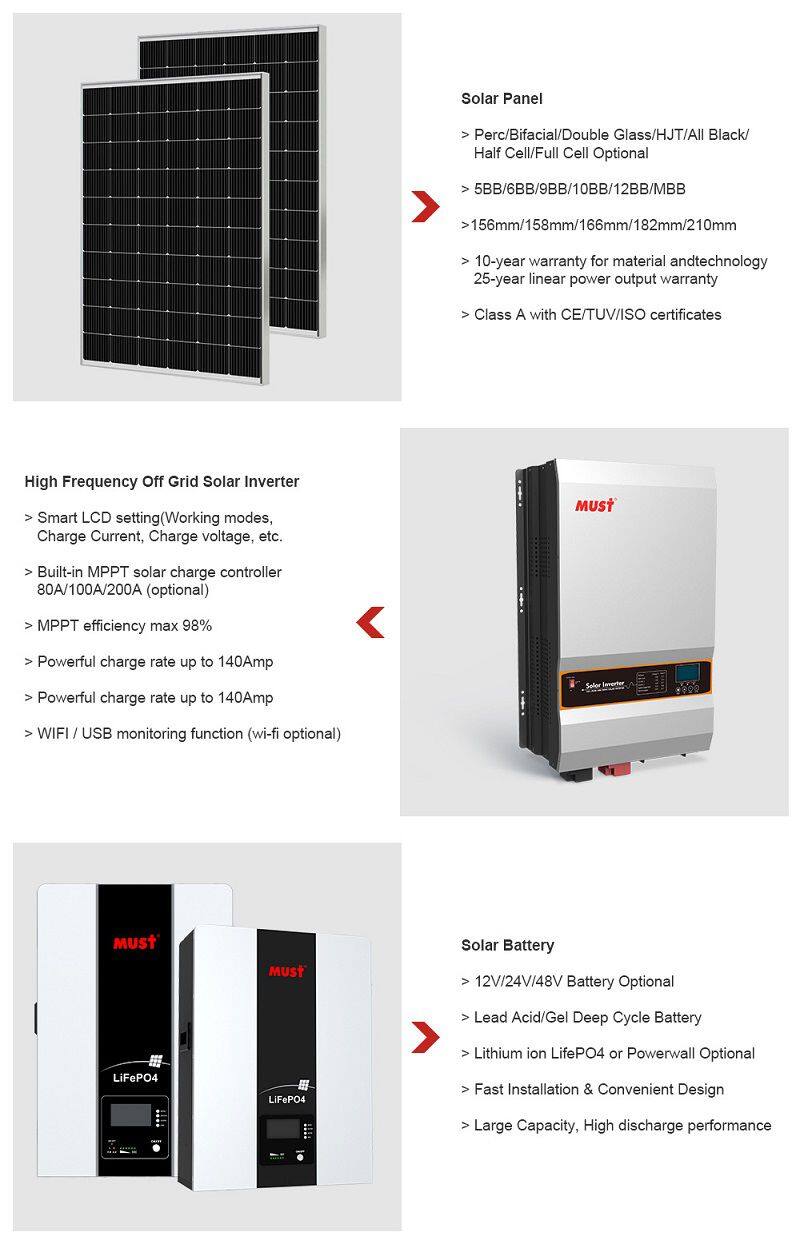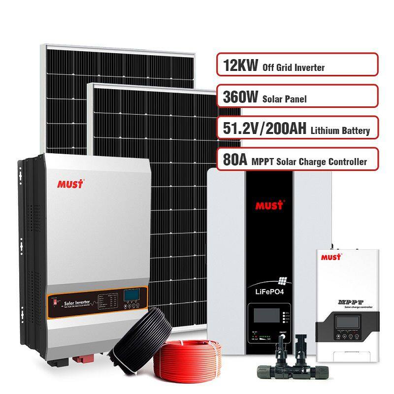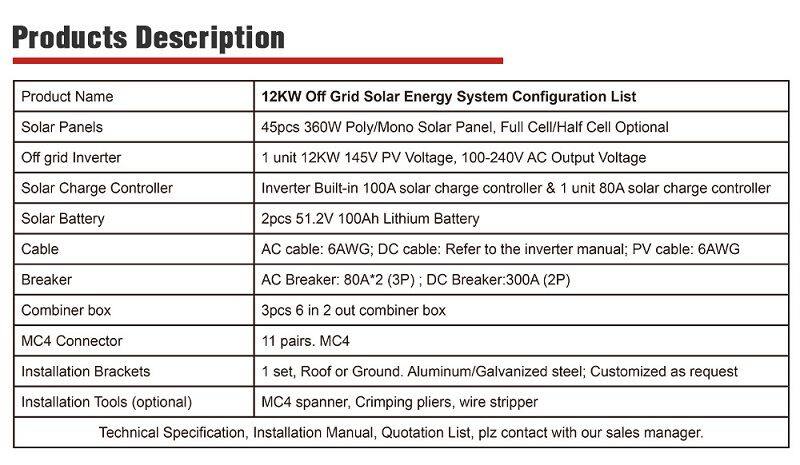 Die Solar-Wechselrichter in diesem System reichen von 1KW bis 12KW und k?nnen auch mit 6 Einheiten parallel betrieben werden, um eine Leistung von 72KW zu erreichen. Lithiumbatterien mit einer Kapazit?t von 51.2V/100 - 300AH k?nnen ebenfalls mit 15 Einheiten parallel geschaltet werden, um eine Leistung von 75KWH zu erzielen.
