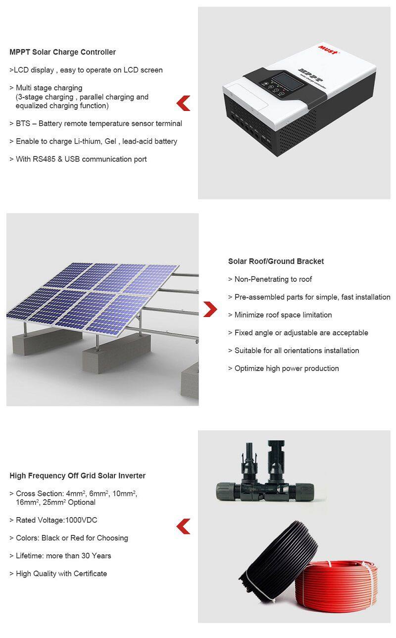 Die essentiellen Zubeh?rteile in diesem Plan umfassen spezielle Photovoltaikkabel und Steckverbinder. Die Kabel für die Photovoltaikmodule k?nnen zwischen 10 - 30 Metern ausgew?hlt werden. Wenn die Standardausstattung der Photovoltaikkabel und Steckverbinder die Bedürfnisse nicht vollst?ndig erfüllen kann, wird empfohlen, dass die Kunden die fehlenden Teile vor Ort kaufen. Darunter sind das Photovoltaik-Sammelschaltkasten und der Photovoltaikpanel-Tr?ger gew?hnliche Hardwarekomponenten, die vom Benutzer selbst konfiguriert werden k?nnen.