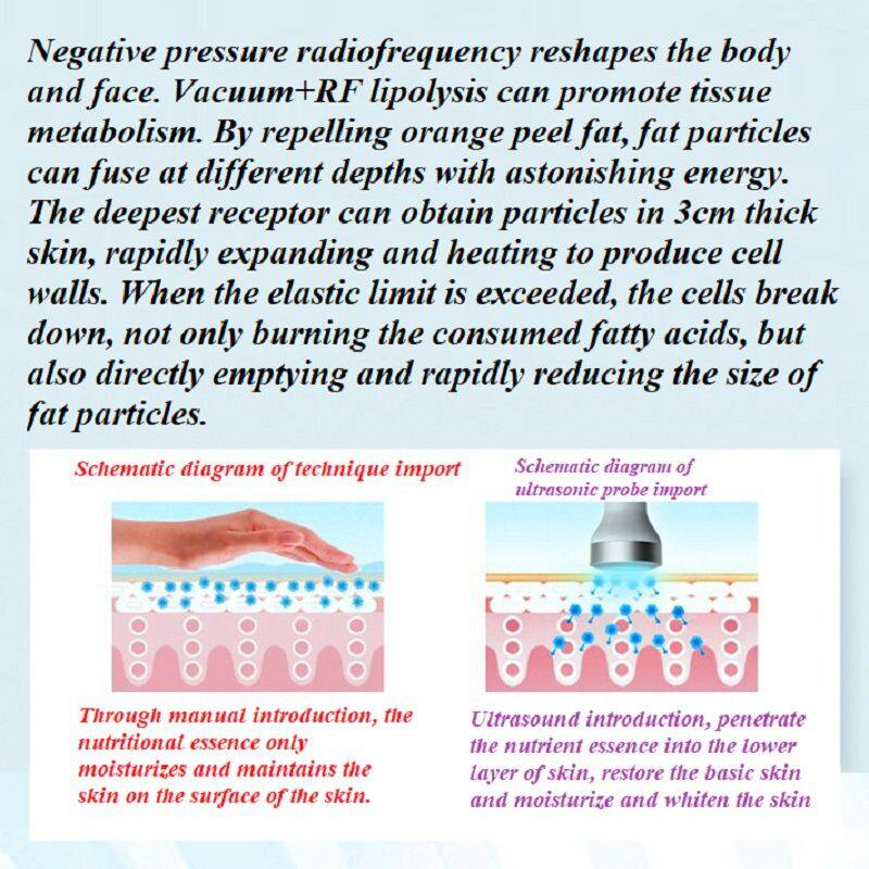 40K-Sprengfettkopf (Dualkern), in der Lage: Schnelle Schallwellen, fokussierte Wellen, um 40KHz-Schwingungswellen in der subkutanen Fettgewebeschicht zu erzeugen, thermische Energie zu fokussieren und die gesamte K?rperoberfl?che sicher mit Schallwellenenergie zu überdecken.