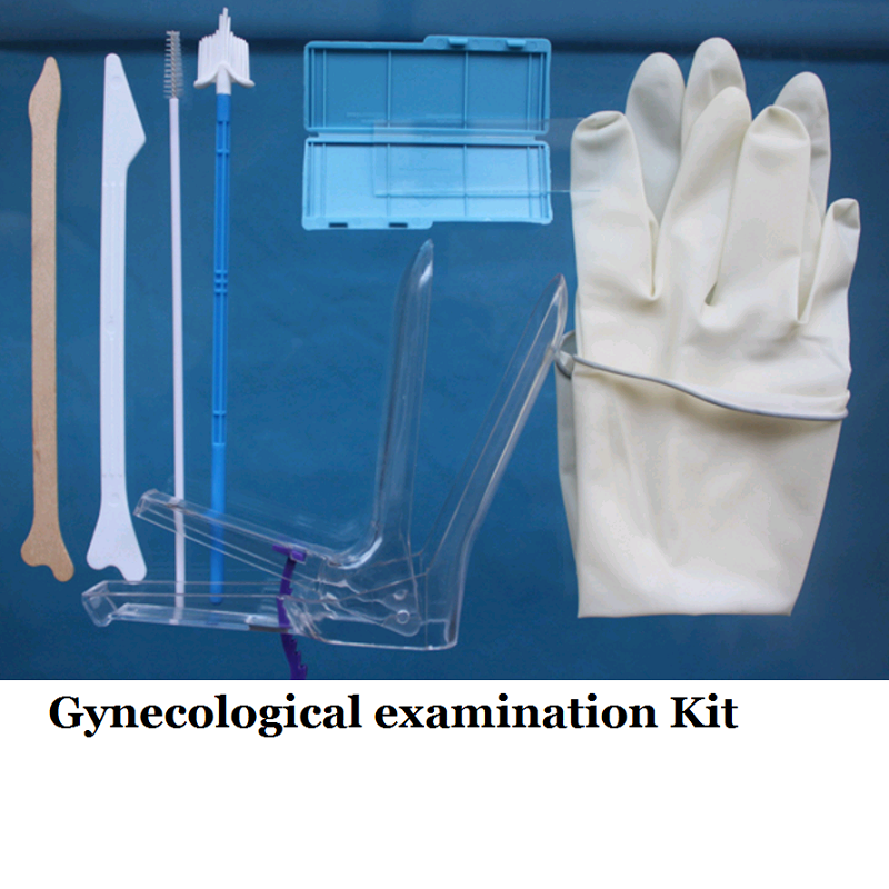 Kit de examen ginecológico, con portaobjetos, guantes, espéculo, curetaje cervical, hisopo, cepillo de muestreo y otros artículos. Empaque: 1000 por cartón, peso bruto 20 kg. Tama?o de la caja exterior: 46 * 43 * 64 cm.