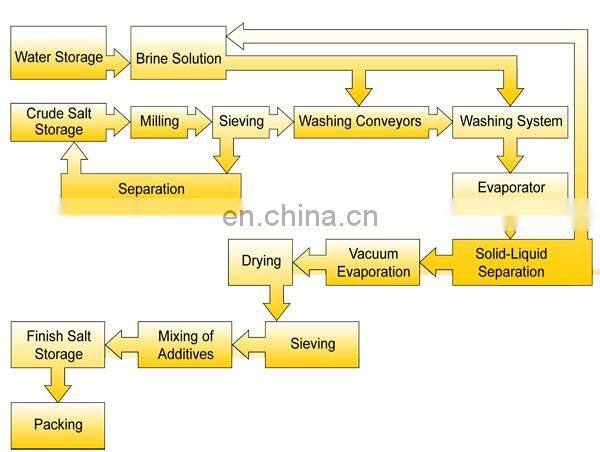 La sal cruda se transporta a la máquina de lavado de sal helicoidal para el primer lavado, luego se tritura con un triturador de rodillos para obtener sal de tama?o adecuado. Este tipo de sal se lavará dos o tres veces en una máquina de lavado por agitación y una máquina de lavado en contracorriente, y luego se obtendrá sal purificada. El siguiente paso es introducirla en la centrífuga para eliminar la mayor parte del agua. Después de esto, la sal se secará en una cama de secado por fluido vibratorio para obtener la sal terminada con un contenido de agua del 0,4%. Durante el transporte de la sal de la centrífuga a la cama de secado por fluido vibratorio, habrá una máquina de iodado para agregar yodo a la sal. El último paso es empaquetar la sal terminada.