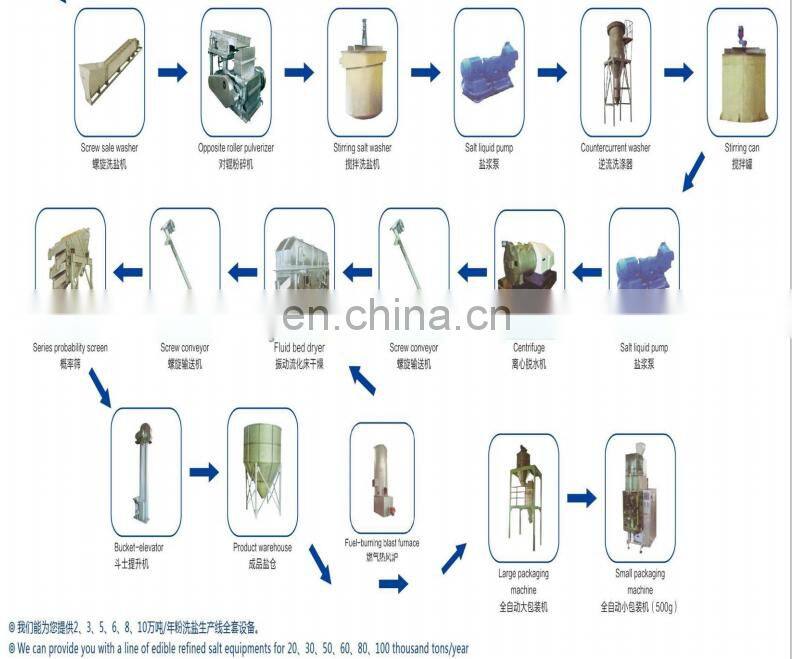 La línea de equipos de sal refinada lavada y triturada incluye: elevador de acero inoxidable, mezclador, transportador, triturador, máquina de lavado de sal, máquina de iodado, centrífuga y secadora, depurador de polvo, máquina de empaquetado, etc.