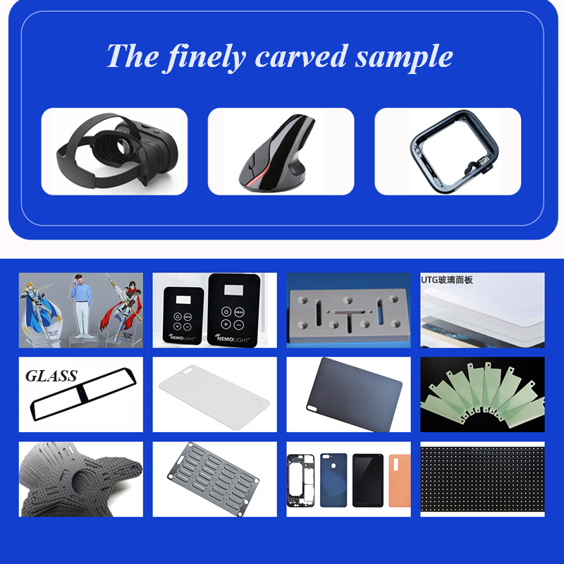 Materiales que se pueden tallar finamente: acrílico, cerámica, vidrio, plástico, plástico, materiales compuestos, fibra de vidrio y fibra de carbono, metales de ferretería, cobre y aluminio, PC, PVC, PET y otros materiales.