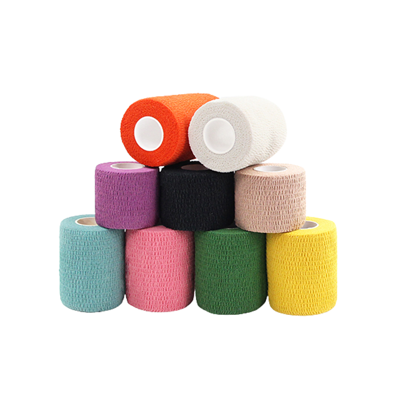 La venda elástica autoadhesiva de no tejido tiene 5 especificaciones, incluyendo 2.5 * 450 / 5 * 450 / 7.5 * 450 / 10 * 450 / 15 * 450cm, y más de 10 colores, incluyendo blanco / azul / rosa / púrpura / rojo / verde / marrón. Material: tela no tejida + spandex + látex natural. Envase: envase independiente de película PP, función: tecnología anti-alérgica, protección deportiva y recuperación de lesiones deportivas médicas.