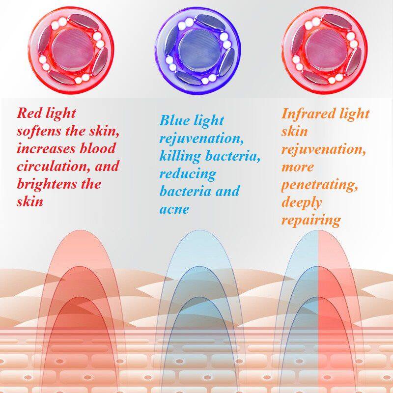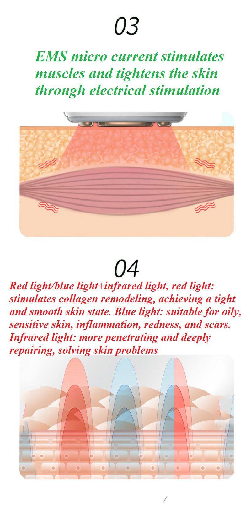 4. Luz roja/luz azul + luz infrarroja. Luz roja: estimula la remodelación del colágeno, logrando un estado de piel firme y lisa. Luz azul: adecuada para piel grasa, sensible, inflamada, enrojecida y con cicatrices. Luz infrarroja: más penetrante y con reparación profunda, resuelve problemas de piel.