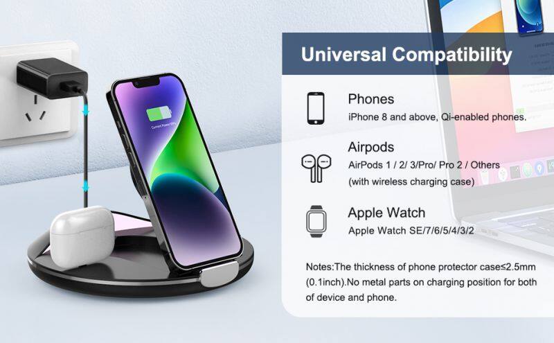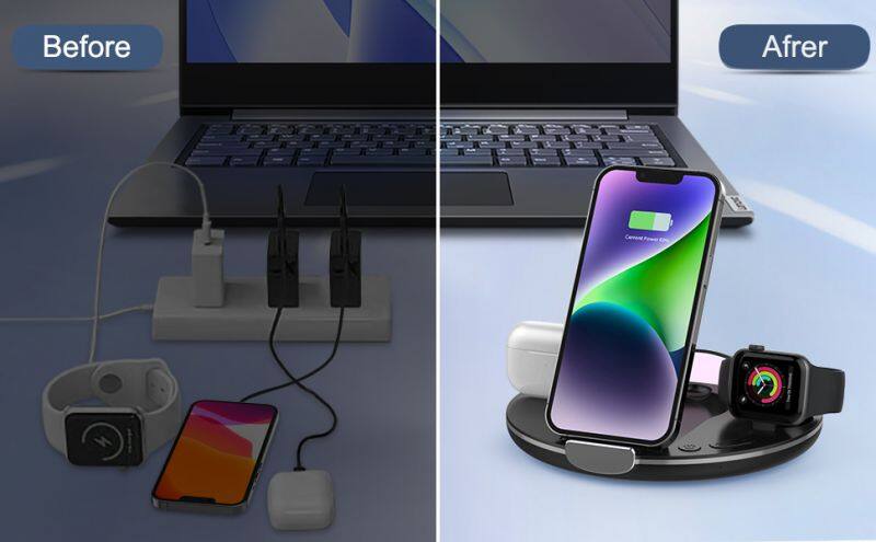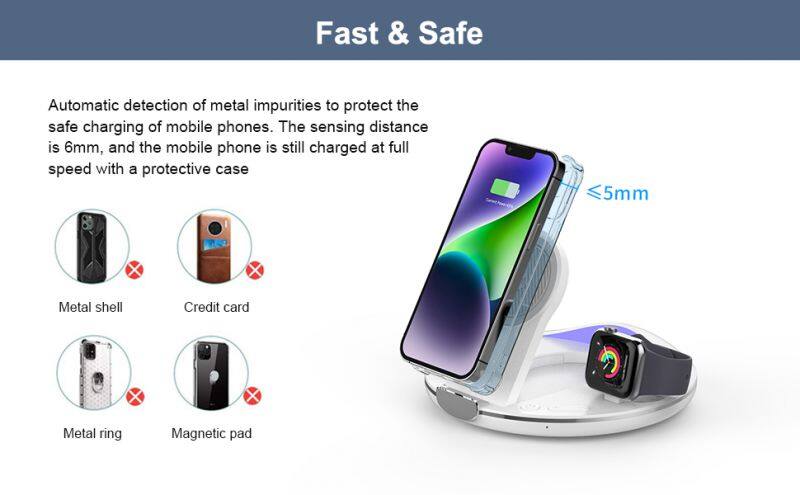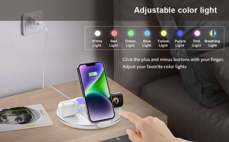 Características | 1: Cargador inalámbrico rápido de 15W, compatible con 10w, 7.5w y 5w. 2: Carga inalámbrica de 3W para auriculares TWS 3: Cargador inalámbrico de 2W para la serie iWtache 4: Luz nocturna colorida | ||||||