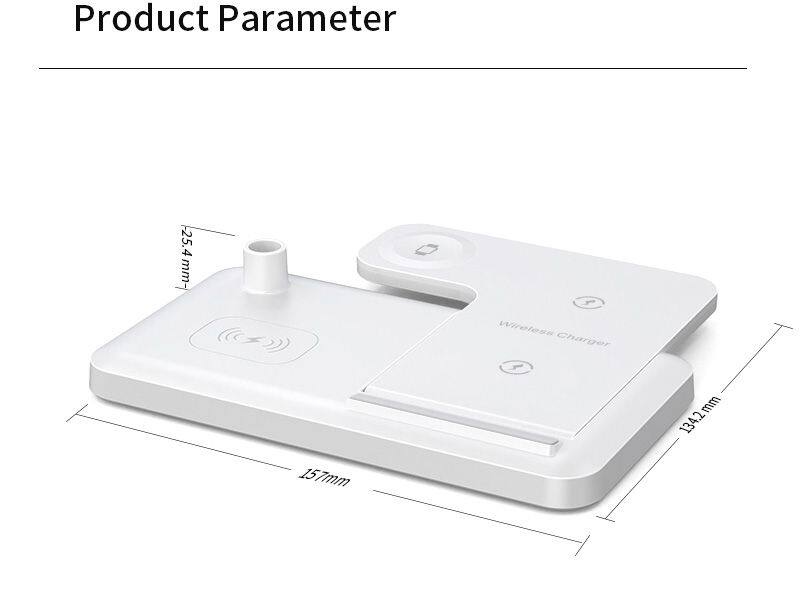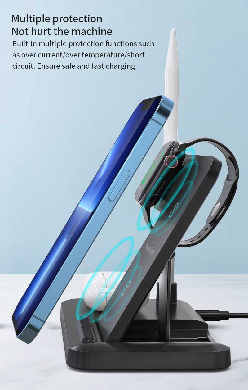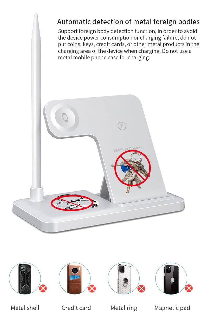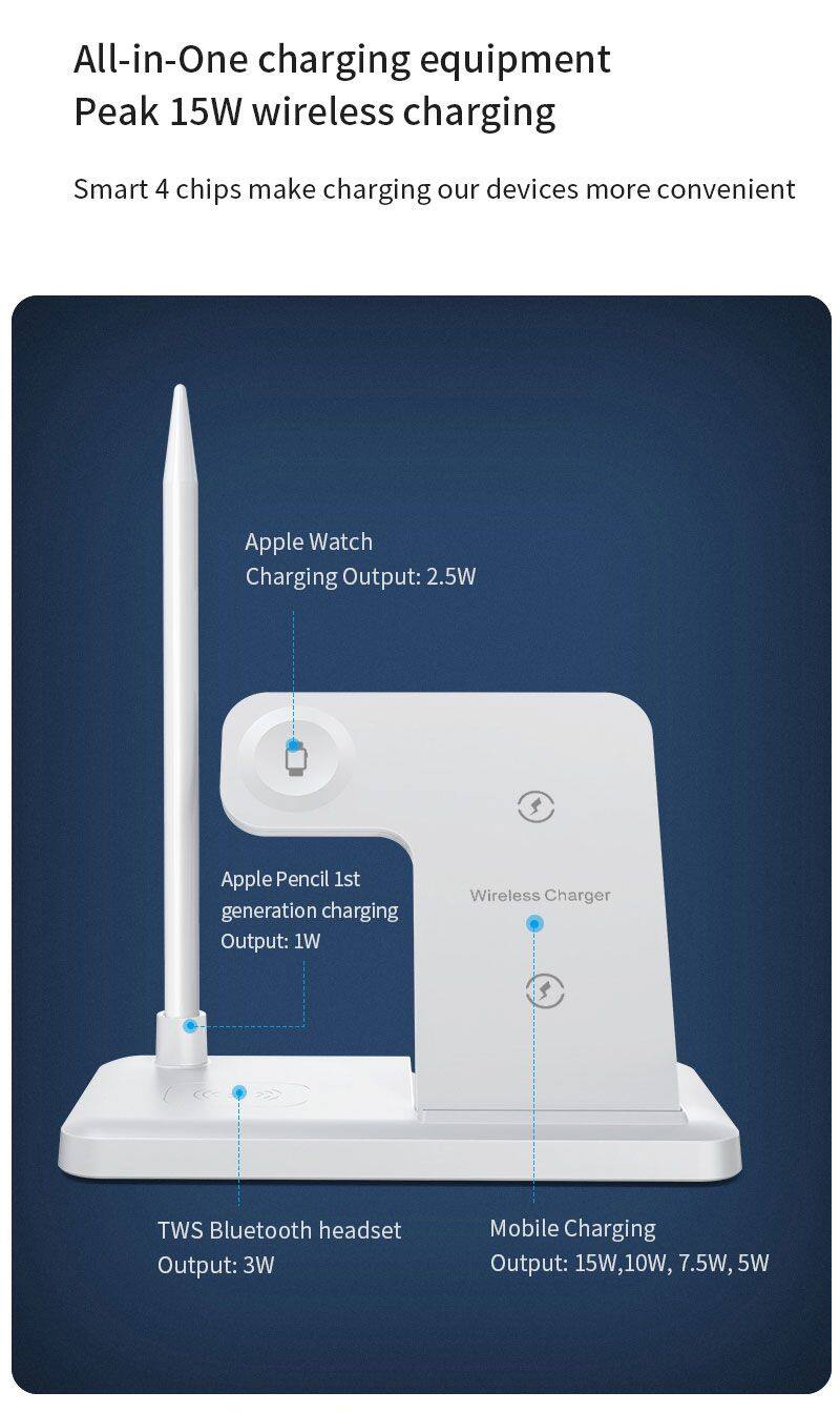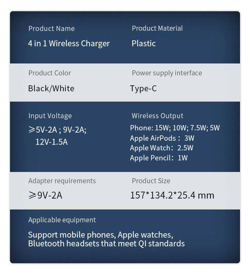 Característica | 1: Cargador inalámbrico rápido de 15W, compatible con 10W, 7.5W, 5W. 2: Carga inalámbrica de 3W para AirPods 3: Cargador inalámbrico de 2.5W para iWatch 4: Cargador inalámbrico de 1W para Apple Pencil 5: Cargador inalámbrico plegable | ||||||
