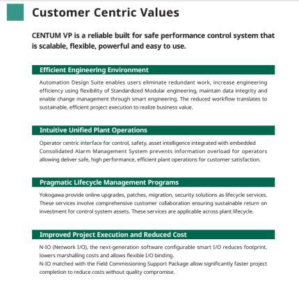 CENTUM VP ofrece soluciones en operaciones, seguridad y gestión de activos a través de la gestión optimizada de datos presentados mediante la integración visual cognitiva para los operadores. Por ejemplo, la Estación de interfaz humana CENTUM VP (HIS) ofrece una visualización integrada de alarmas desde el DCS, el Sistema de instrumentación de seguridad (ProSafe-RS) y el Sistema de gestión de activos del Gestor de recursos de planta de Yokogawa (PRM) que facilita operaciones fluidas en múltiples sistemas de control. | ||