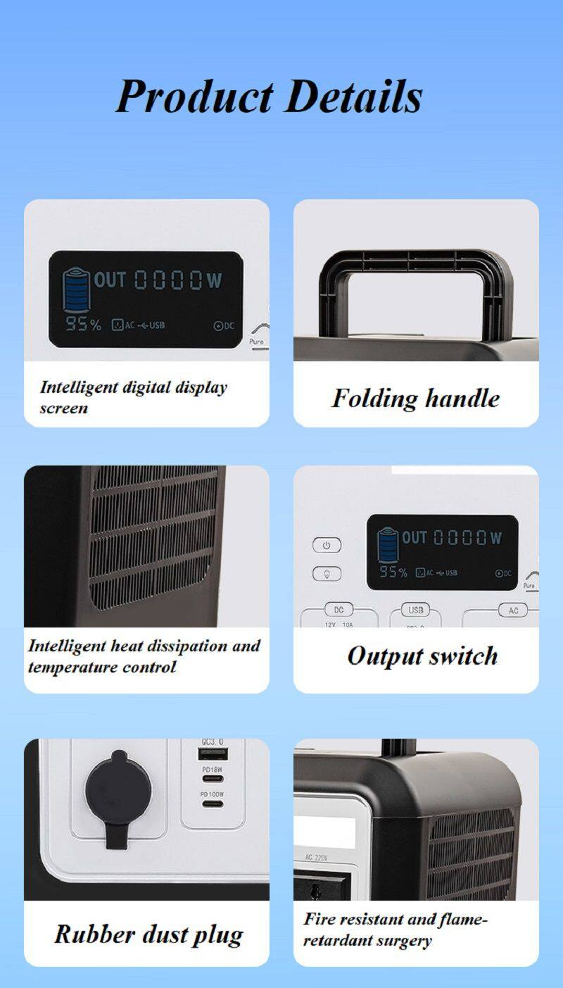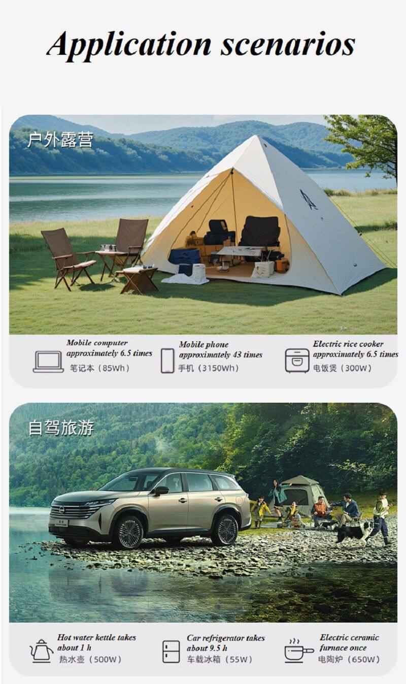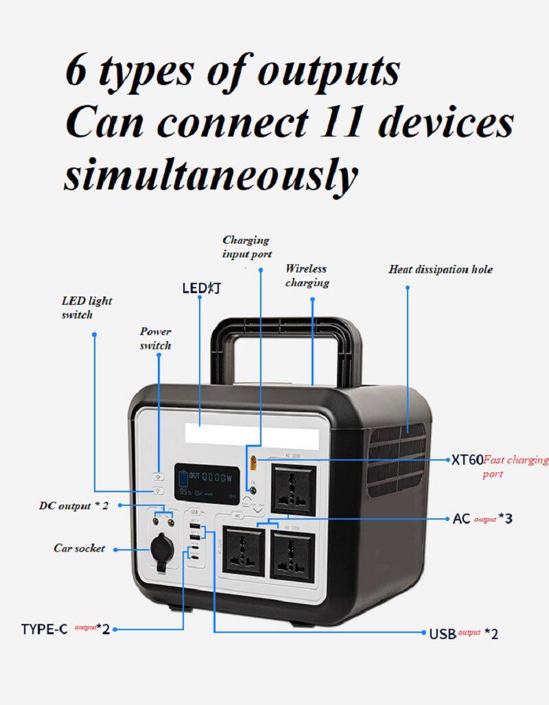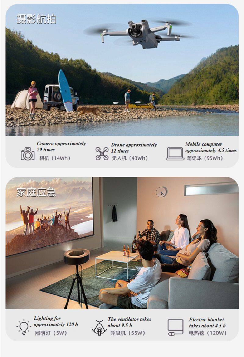 Il peut charger divers appareils tels que les cuisinières à riz, les réfrigérateurs, les ordinateurs portables, les téléphones portables, les couvertures électriques, les luminaires, les bouilloires, les fours électriques, les appareils photo, les drones, etc.