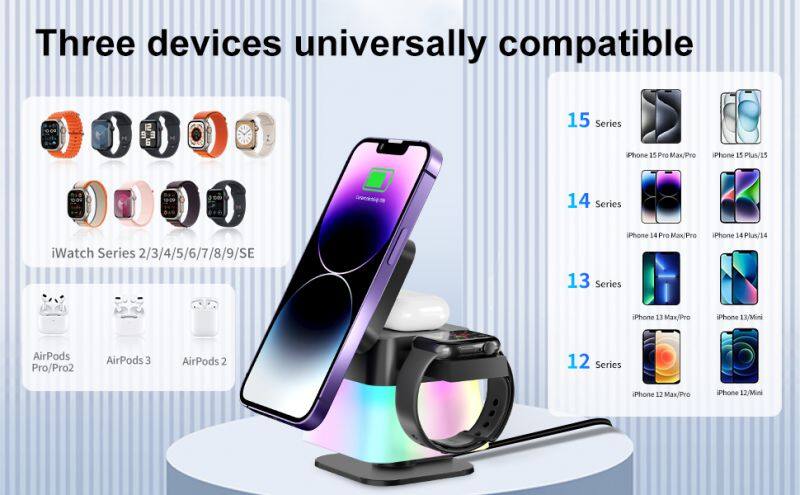 3-in-1 Wireless Charger With LED Nightlight 15W Fast Charge Multi-function Charging Support Devices ABS+ Metal Bracket