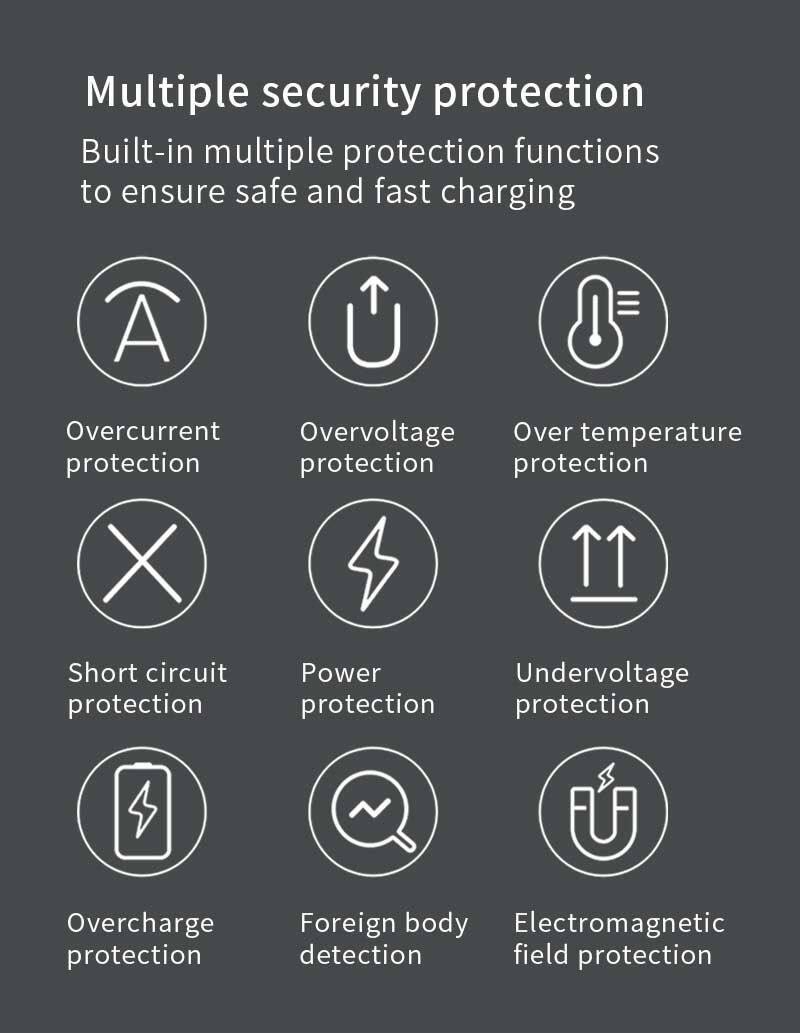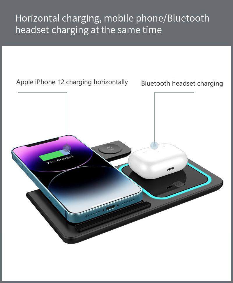 Caractéristiques | 1 : Chargeur sans fil rapide 15W, compatible avec 10W, 7,5W, 5W. 2 : Charge sans fil 3W pour AirPods 3 : Chargeur sans fil 2,5W pour iWatch 4 : Chargeur sans fil pliable 5 : Avec lampe d'ambiance | ||||||