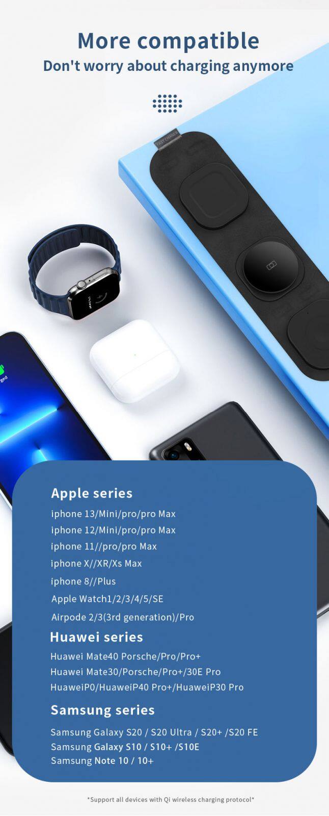 Caractéristiques | 1 : Chargeur sans fil rapide double 15W, compatible avec 7,5W, 5W. 2 : Chargeur sans fil 2,5W pour iWatch 3 : Chargeur sans fil 3W pour écouteurs 4 : Pliable et portable 5 : Verre trempé transparent 2,5D + bo?tier métallique |