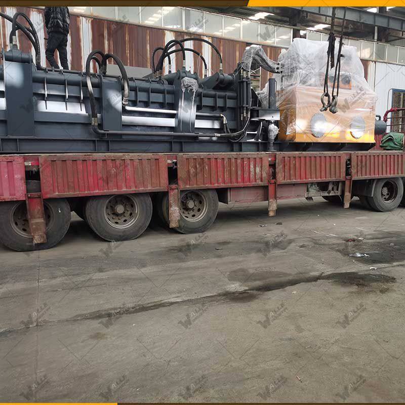 Le vérin latéral est un vérin hydraulique à simple tige de piston double effet, qui est connecté au support de vérin latéral avec une bride, et la tige de piston est connectée à la tête de pression latérale avec un axe de pivot pour pousser la tête de pression latérale à se déplacer en avant et en arrière, à gauche et à droite pour la compression finale, de sorte que les matériaux préalablement formés dans la chambre de compression forment finalement un paquet.