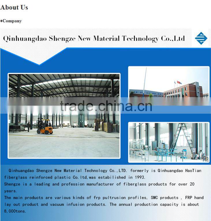 Qinhuangdao Shengze New Material Technology Co.,LTD. formerly is Qinhuangdao HaoTian fiberglass reinforced plastic Co.ltd,was estabilished in 1993. Shengze is a leading and profession manufacturer of fiberglass products for over 20 years. The main products are various kinds of frp pultrusion profiles, SMC products , FRP hand lay out product and vacuum infusion products. The annual production capacity is about 8,000tons. ShengZe with complete sets of professional equipment from fiberglass raw material manufacturing to after treatment. There are 10 advanced frp pultrusion production lines, SMC production line, special frp hydraulic equitment from 100tons-3000tons, RTM production lines and test machine etc. With decades of experience and performance based on excellent technology and dedication to the top quality standards in manufacturing and customer satisfaction. ShengZe ensures our solutions are the most innovative and cost effective ones. As an ISO accredited Company, Shengze shows committed to quality, customer and a willingness to improve efficiency. Shengze FRP products have exported to South Asia, Middle Asia and Middle East, Europe , American and got high praise. We sincerely welcome guests from domestic and abroad to visit and cooperate with us!
