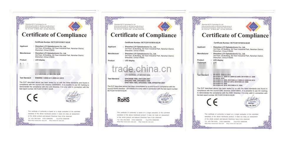 SHENZHEN LIYI OPTOELECTRONIC Co., Ltd is a Chinese high-tech optoelectronics display enterprise which specializes in the research, development, production, sales, construction and service. Specializing in LED field since 2009, we took innovation in the market and product classification and innovative products already have strong core competitiveness. LIYI Tech established strict quality control over all of LED components, LED display and the whole set of video systems, devoting to provide the most suitable indoor or outdoor display system solutions from design, manufacturing, installation and maintenance. Our products are widely used in postal, telecommunications, financial securities, electricity, transportation, schools, hospitals, supermarkets, hotels, weather, real estate, sports, stage, restaurants, entertainment, theater, municipal advertising and government departments etc., and exported to Europe, Asia, North America^, with projects across several provinces in Mainland. Adhering to the business philosophy of "customer first, pragmatic and efficient ", we believe that technology will create the future, continually play our strengths to win the trust of users with leading technology, excellent quality, exquisite craftsmanship and sincere service to seek goodness and beauty. Main products: LED pharmacy cross, LED indoor display, LED outdoor display, LED single color display, LED moving sign, LED two-side display, LED Banner sign, LED window screen, LED flooring advertising screen, LED display accessories and LED lighting. Company insist in the core value of "honesty, dedication, win-win basis and transcend" to provide customers with quality service and sincerely thanks to friends' trust around the world!