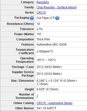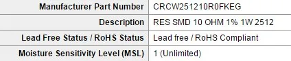 | Model Number | CRCW251210R0FKEG | Type | Other, resistor | |