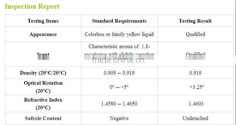 Main composition: 1,8-Cineole (above 80%), camphene, Cress Ene, terpineol, and geraniol acetate alcohol isoamyl aldehyde, ketones, citronellal and pepper.