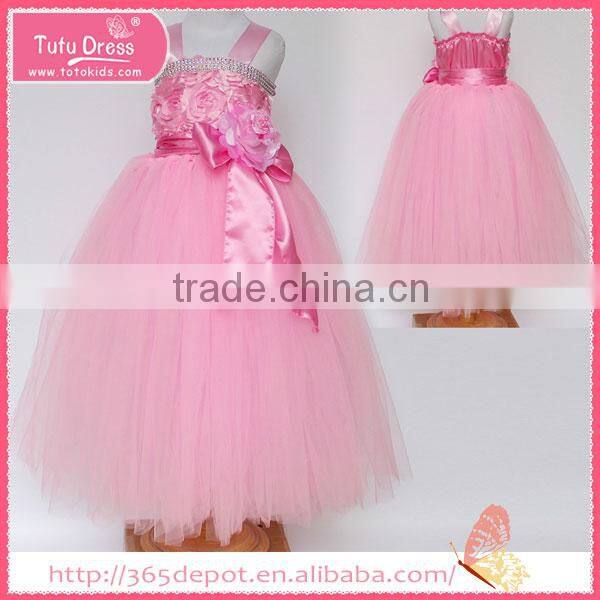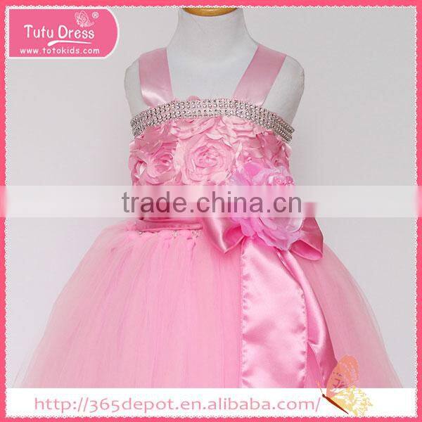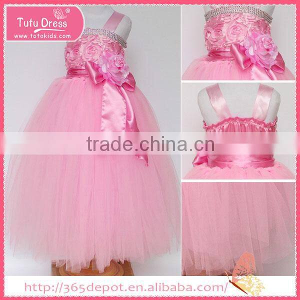 Satin Fabric baby pink rosette prom dress tulle skirt children frocks designs