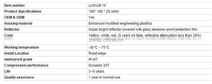 Led Solar road stud adopt high brightness LED as light source, according with safety standards, energy saving, high visibility, installation easily, long life, stable and reliable, non-corrosive cables, no conventional energy consume, widely used in highway traffic safety alerts. It can effectively prevent traffic accidents.