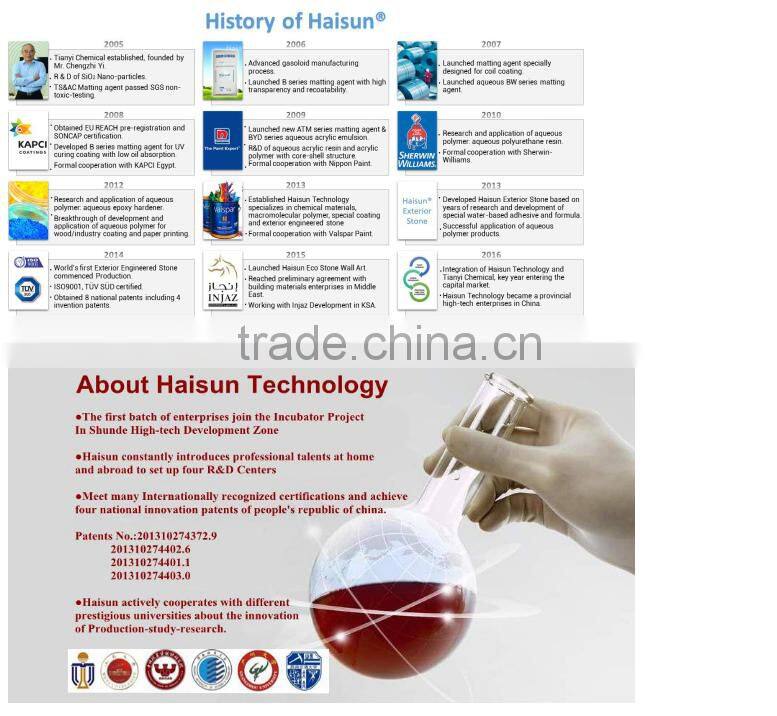 Haisun technology specializ in producing silica dioxide powder and water based resin system for paint. It is located in Shunde,Guangdong,China. Our powder products sales amounted to 30,000 tons each year and aqueous synthetic resins (including waterbase polyurethane resins, waterbase epoxy resins and acrylic emulsion) sales reached 5000 tons annually. Our products have been opened European Market, Middle East market, South America market, Southeast Asia market and Africa market successfully. We have established long term cooperative relationship with many world-class chemicals manufacturers, like Valspar, Sherwin-williams and so on.