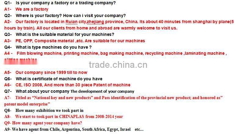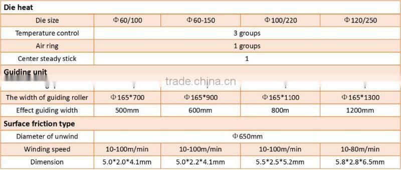 This machine is used for blowing plastic film like HDPE,LDPE,LLDPE, etc .The extruder system has super strong mechanism intensity,well capability and wear,screw and die special design. For increasing the capacity.