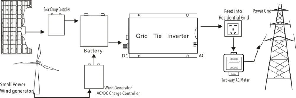 ③ Work with battery, PV module and wind turbine charging the battery and battery discharging to inverter for converting AC power which will feed into power grid.