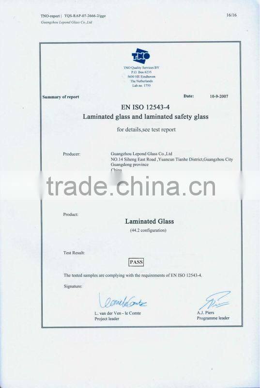Guangzhou Lepond Glass Co.,Ltd is a company specialized in deep-processing glass and glass wholesale of various glass products. It locates in one of the most active economical area in Guangzhou, Guangdong Province. Our company is a well-equipped one and owns a number of years' experienced high-quality staff who engaged in glass technology R&D. With the newly developed products at home and abroad, we aim to provide products and services of good quality products, to deliver punctually and to fully make our customers satisfied. Because of our abundant financial resources, good quality equipments, advanced technology and the ability of strong innovation, our products has passed 3C (China Compulsory Certification) national certification as well as ISO9001:2000 quality system certification.