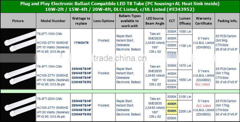 2016 New Arrival! Ballast Compatible Led Tube 15W 20w 22W 4ft CE EMC Tuv Dlc ul Cul Approved