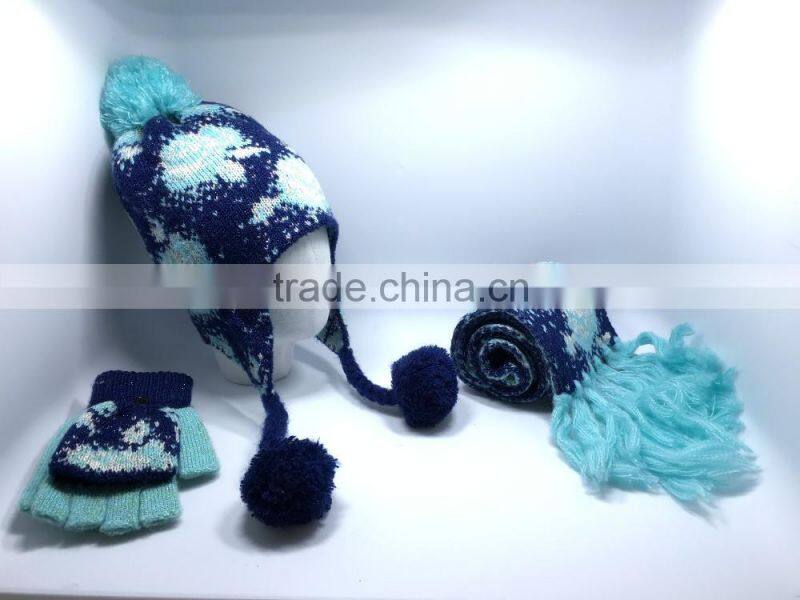 Chevron Jacquard Pattern Kintted Winter Earflap Girl Hat With Fun Poms Fringe Scarf Gloves 3pc Set