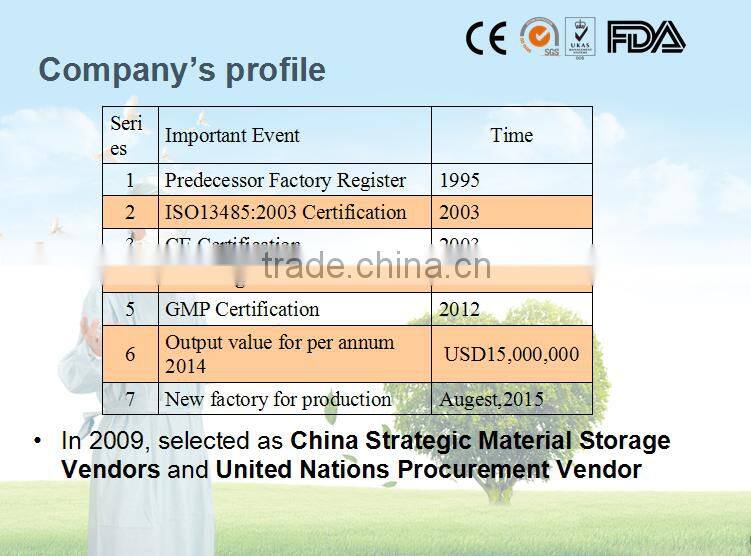 We have all kinds of professionals, researching and developing ability, huge production capacity and distributor network both in domestic and oversea market.We have obtained different certificates such as ISO13485,CE,FDA and national GMP quality system certificate,national production license of medical device class Ⅱ,approved registration etc.