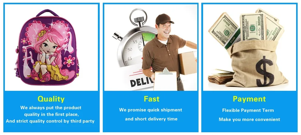 3) We can manufacture all kinds of School bags,backpacks,travel bags,shopping bags,trolley bags,computer bags,cooler bags, outdoor bags, etc.Pls feel free to send us your own designs, we will offer you counter samples very quickly and quote you best prices .Welcome to contact us for any inquiry ,we will give your a prompt reply.