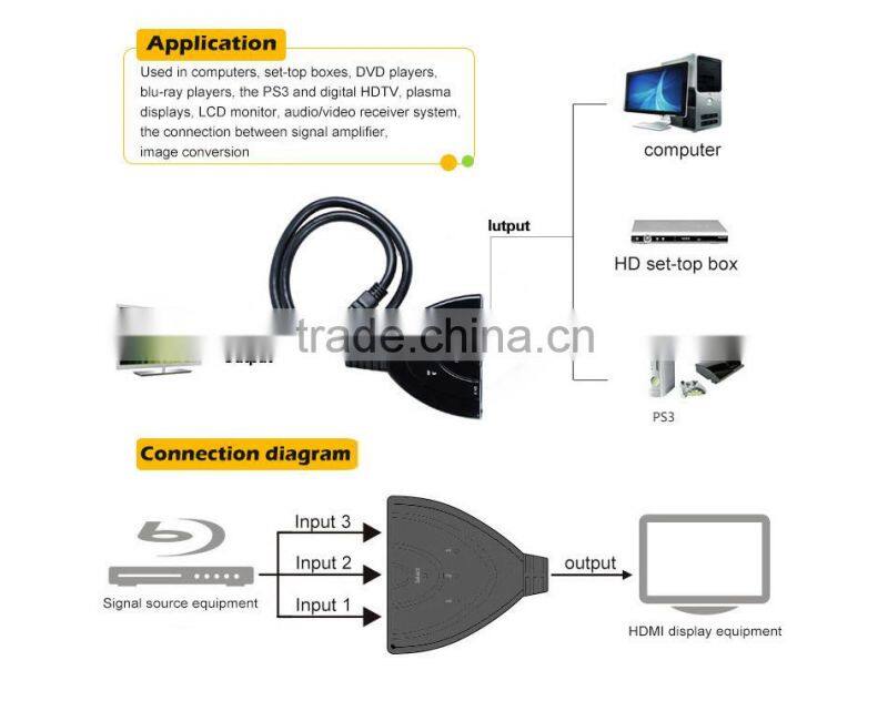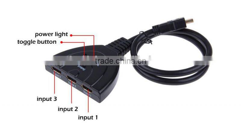 Hot selling 3 Port HDMI Switch / Switcher / Selector / Splitter With Accessory Wire Winder