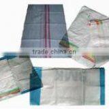 We have five size pp woven bags in our warehouse.They are 100% virgin polypropylene,misprinted bags,never be used,cheaper and high quality.If you need,contact me:doris.teng89 Generally ,we work on OEM orders,that means size,weight per bag,loading weight,quantity,printing,etc will depend on you requests.