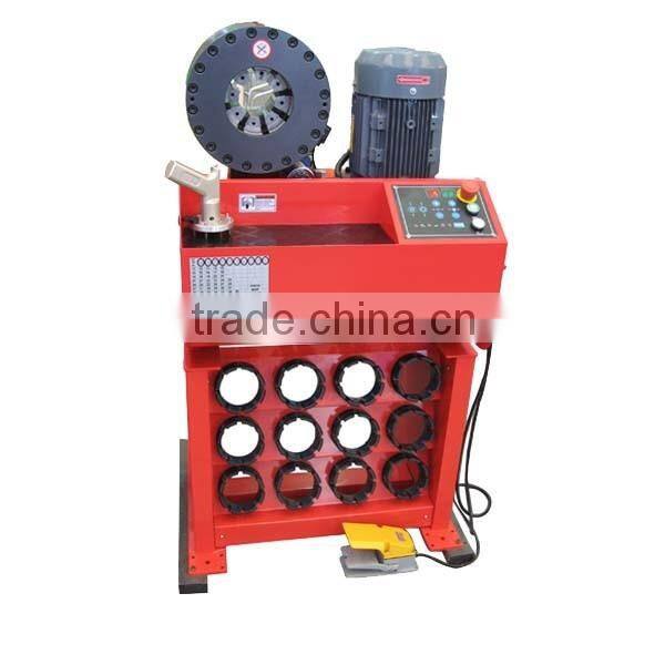 Hose crimping machine mainly by withholding mechanism, motor, gear pumps, control valves and tank components. Suitable for mechanical engineering in the high-pressure hose assembly with hold processing, but also with hold two-way elbow, elbow and large shaped head. Hose crimping machine is a metal fitting through the hydraulic machinery and the corresponding mold with a high pressure hose withhold closely together to prepare a high-pressure hose and fluid connectors, referred to as high-pressure hose assembly. High-pressure hose assemblies are widely used in oil, coal, aerospace, construction machinery, agricultural machinery and other industries etc.