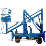 Crank arm type high-altitude lifter for traction,self propelled,vehicle type,simple nvenient use,operation is big,especially to overcome some obstacles or in a lift,can be more work high above the ground,can rotate 360 degrees to work.The elevator is widely used in highway,wharf,shopping malls,sports venues,residential property,factories and workshops in operation.
