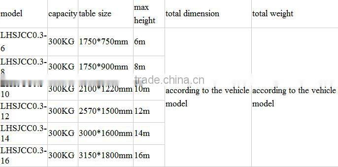 According to the lifting height,the lift can be deviced into 4,6,8,10,12,14,16 meter lifts,equipment capacity is from 300kgs to 500kgs,according to different requirements,it can be mounted onto different vechicles,the lift can be driven by vechicle motor or batteries.