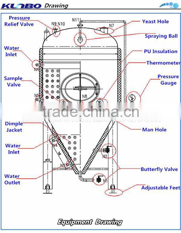 | Configuration | safty valve, CIP spraying ball and pipe at the side of the tank, outlet with valve and racking arm as your requirement, temperature gauge and sample valve |