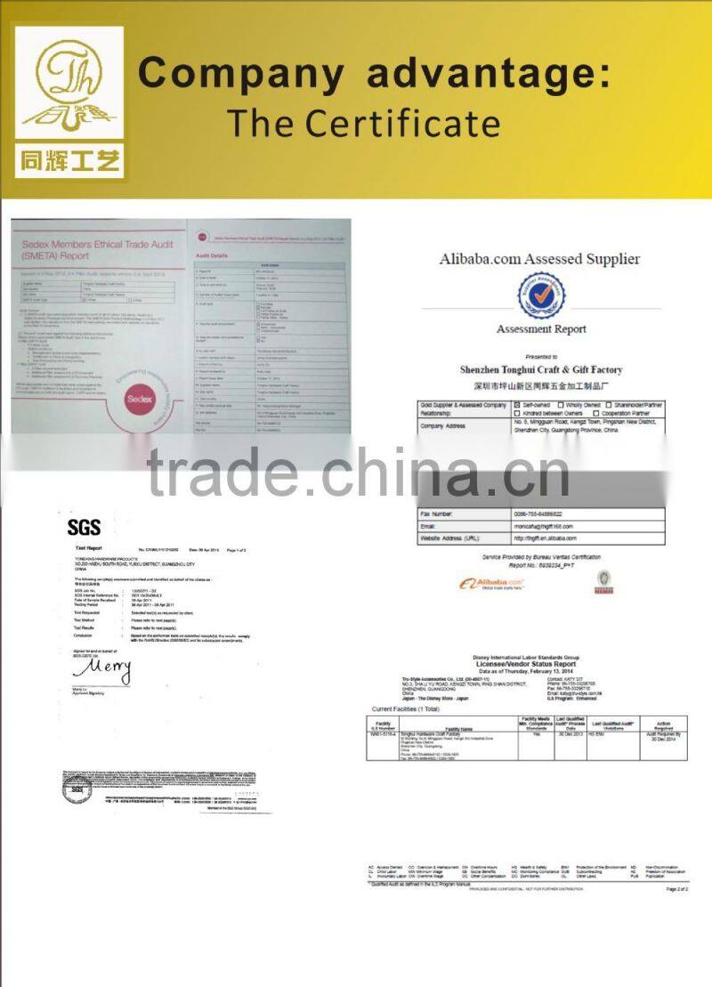 After more than 9 years of great efforts since 2000, Shenzhen Tonghui Craft & Gift Factory, with its persistent belief in "quality is the only guarantee of customers' satisfaction" and devotion to R&D activity, is now one of the leading manufacturers and exporters in China. With a workforce of more than 300 persons, we mainly supply metal, soft enamel and PVC products, as well as professional service to customers worldwide. Metal products include metal badge pins, key chains, bookmarks, golf accessories, tie bars, cuff links, coins and medallions, a wide range of plane-designed and 3-D designed gifts, business promotional items and souvenirs with quality brass. Soft PVC products: We have successfully developed a broad range of soft PVC plane-designed and 3-D designed gifts and promotional items, such as pins, key chains, magnets, watch straps, barrettes, photo frames, coasters, luggage tags, labels and coffee mugs. We are proud of being a producer under the commission of China Telecom, KFC, Life Assurance, Coca-Cola, Amway as well as 2000 Sydney Olympic Games. For further development, we are seeking for the support of partners throughout the world. We believe reliable quality products with impeccable service will satisfy your needs.