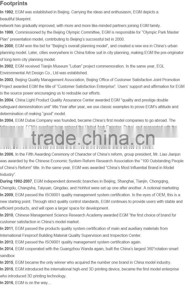 Eastern Ground Model (EGM) was founded in 1992. It has established 17 branches in Shenzhen, Beijing, Chongqing, Taiyuan, Shanghai, Xi’ an, Changsha, Qingdao, Huhhot, Kunming, Changchun, Shenyang, Dubai, Saudi and New Zealand as yet. Eastern Ground Model (EGM) is the first company in the industry to pass the ISO9001 quality management system certification, and to research & develop and use the world leading level 3D print equipment. Meanwhile, it is the first model company to go abroad.