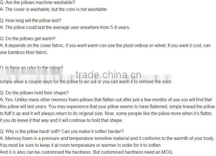 Our company is engaged in the research, development, production and sale of memory foam series products. We mainly offer memory foam, and its corresponding products, such as contour pillow, unique pillow, traditional pillow, cool gel pillow, bamboo charcoal pillow, neck pillow, neck rest car pillow, lumbar cushion and seat cushion etc. With the advantages of environmental protection, anti bacteria, anti-mildew, warm feeling memory deformation, sweat absorbing performance, comfort, high elasticity or slow elasticity, we have gained more and more attention from domestic and overseas customers.