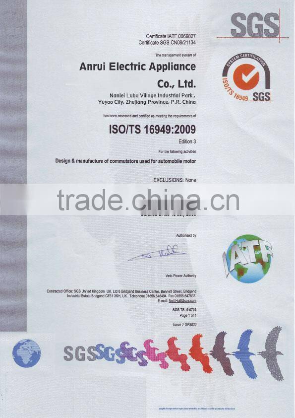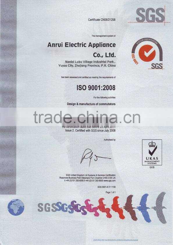 Yuyao Anrui Electrical Appliance Co.,Ltd is professional in manufacturing commutators for more than 10 years,and products of Anrui are certified by GSG,CE,ROHS and the factory has ISO9001.