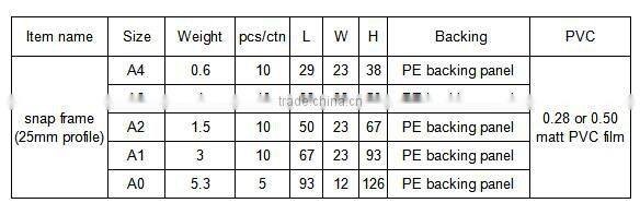1. Made by high quality aluminum, PS back panel and clear transparent PVC sheet in 0.28mm and 0.5mm