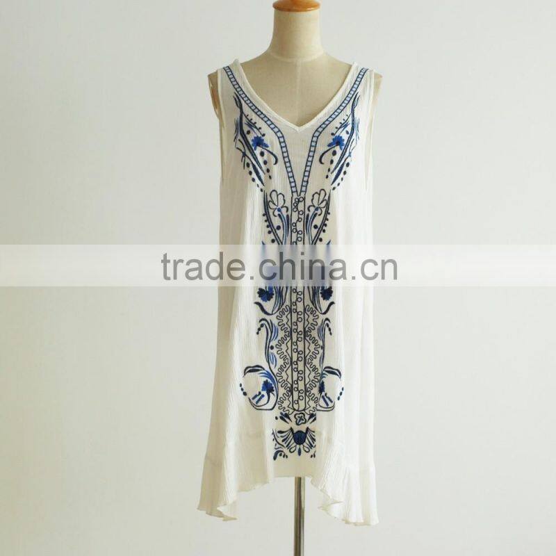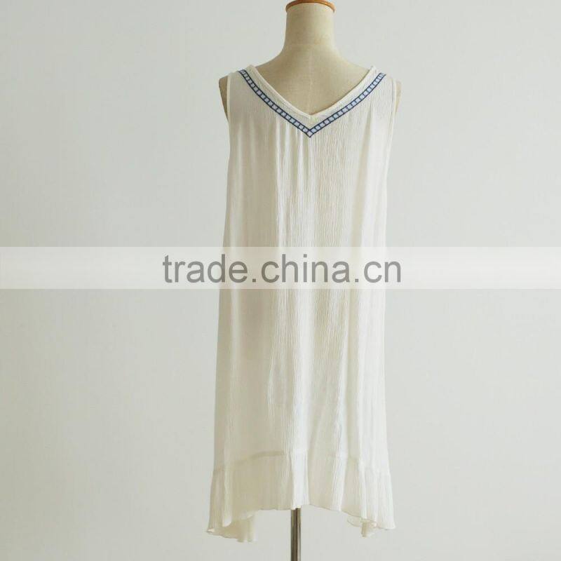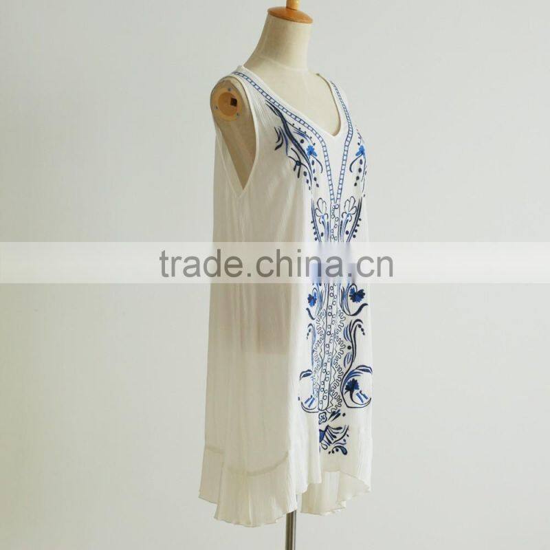 Back of latest design rayon pleated sleeveless embroider women casual one piece dress