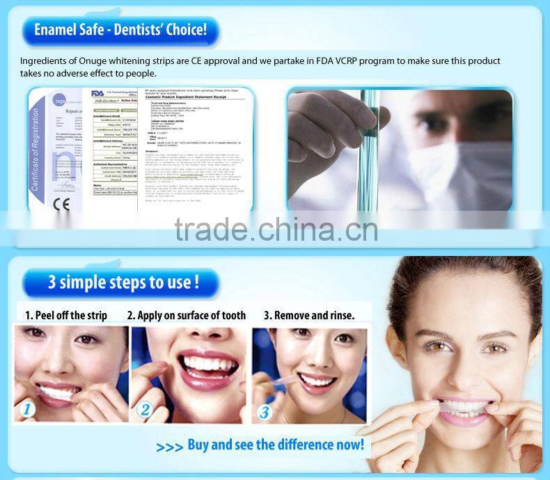 Apply the whitening gel on your teeth and attach the whitening catalysis strips. The whitening catalysis strips could not only protect the gel from spittle but its active ingredient activation formula will accelerate the production of the free oxygen in the gel, make the active ingredient more active and achieve a better teeth whitening effect.