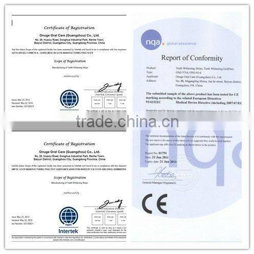 Such whitening system could effectively deal with the exogenous coloration, the teeth color caused by drugs (tetracycline teeth and fluorine spot teeth) and the yellow teeth due to aging. This whitening system has a faster, more convenient and more comfortable utilization.