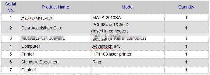 MATS-2010SA Hysteresisgraph is fully automatic, computer controlled equipment to measure on basic magnetization curve and magnetic hysteresis loop at a dynamic state for soft magnetic material at frequency of 20Hz to 500 kHz, automatic measurement of magnetic hysteresis loop of the soft magnetic materials such as silicon steel, precision alloy, non-crystal and ferrite, accurate measurement on the dynamic magnetic characteristic parameters such as amplitude permeability μa, loss angle δ, loss iron Pc, remanence Br and coercivity Hc.